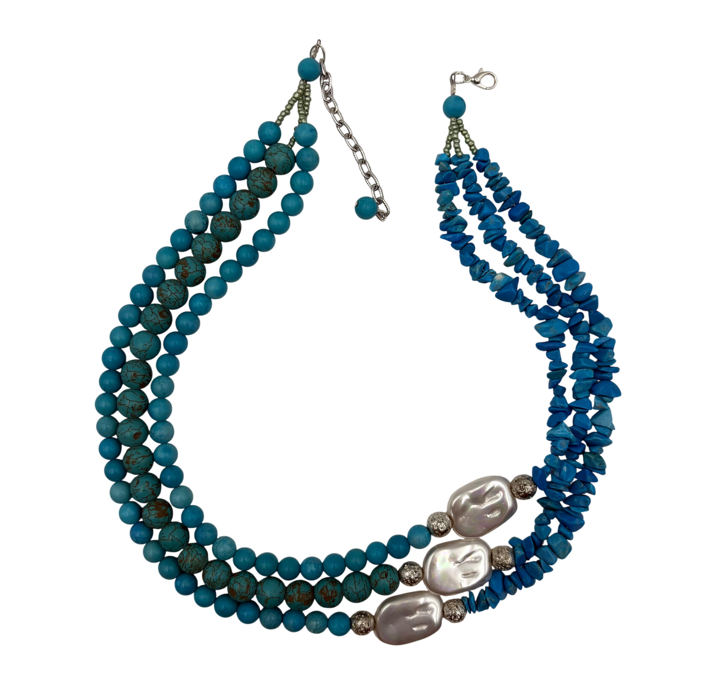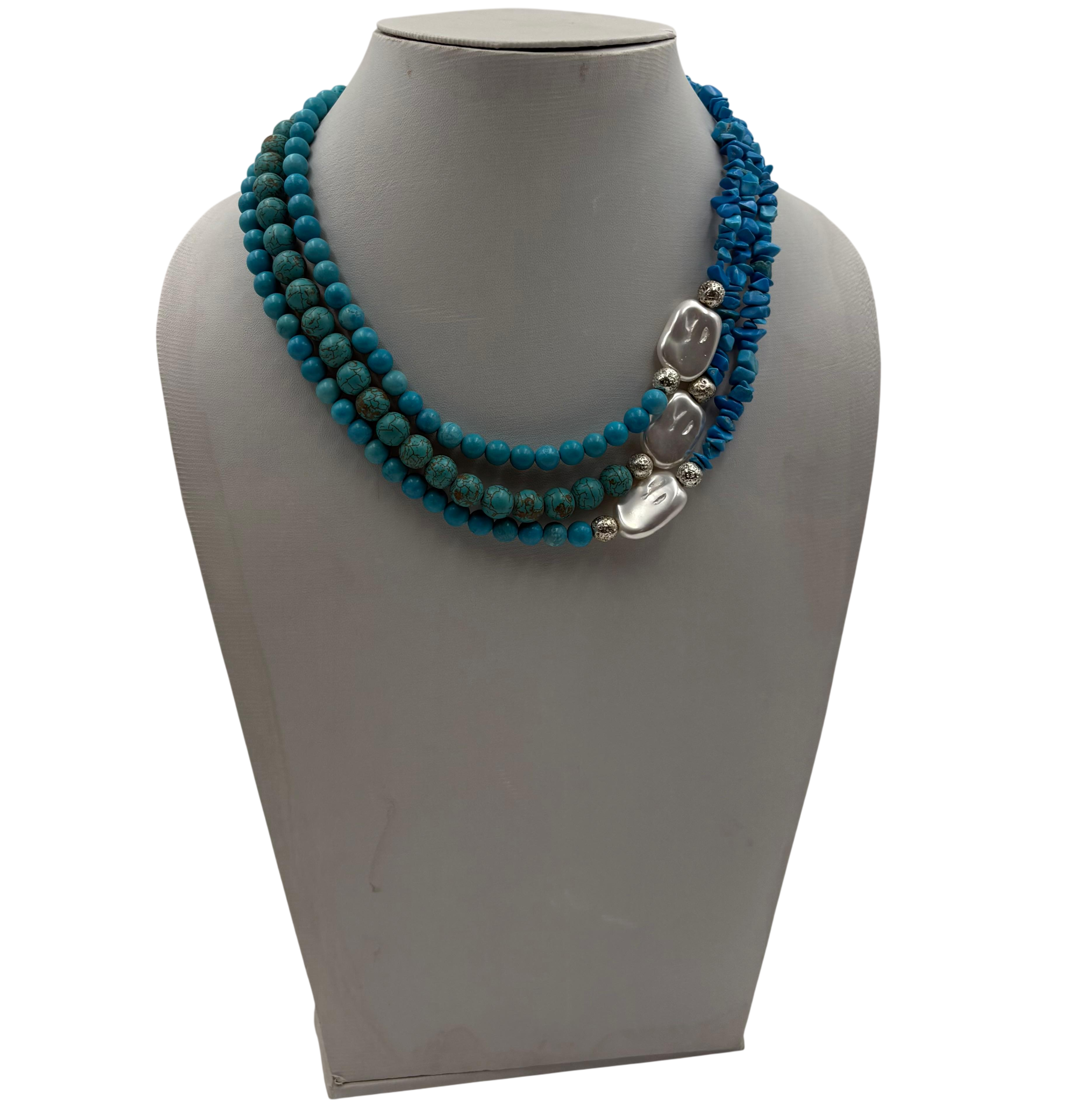 HANDMADE TURQUOISE BEAD & SEMI PRECIOUS CRACKED STONE FLAT SHELL BEAD AND CUT STONE NECKLACE