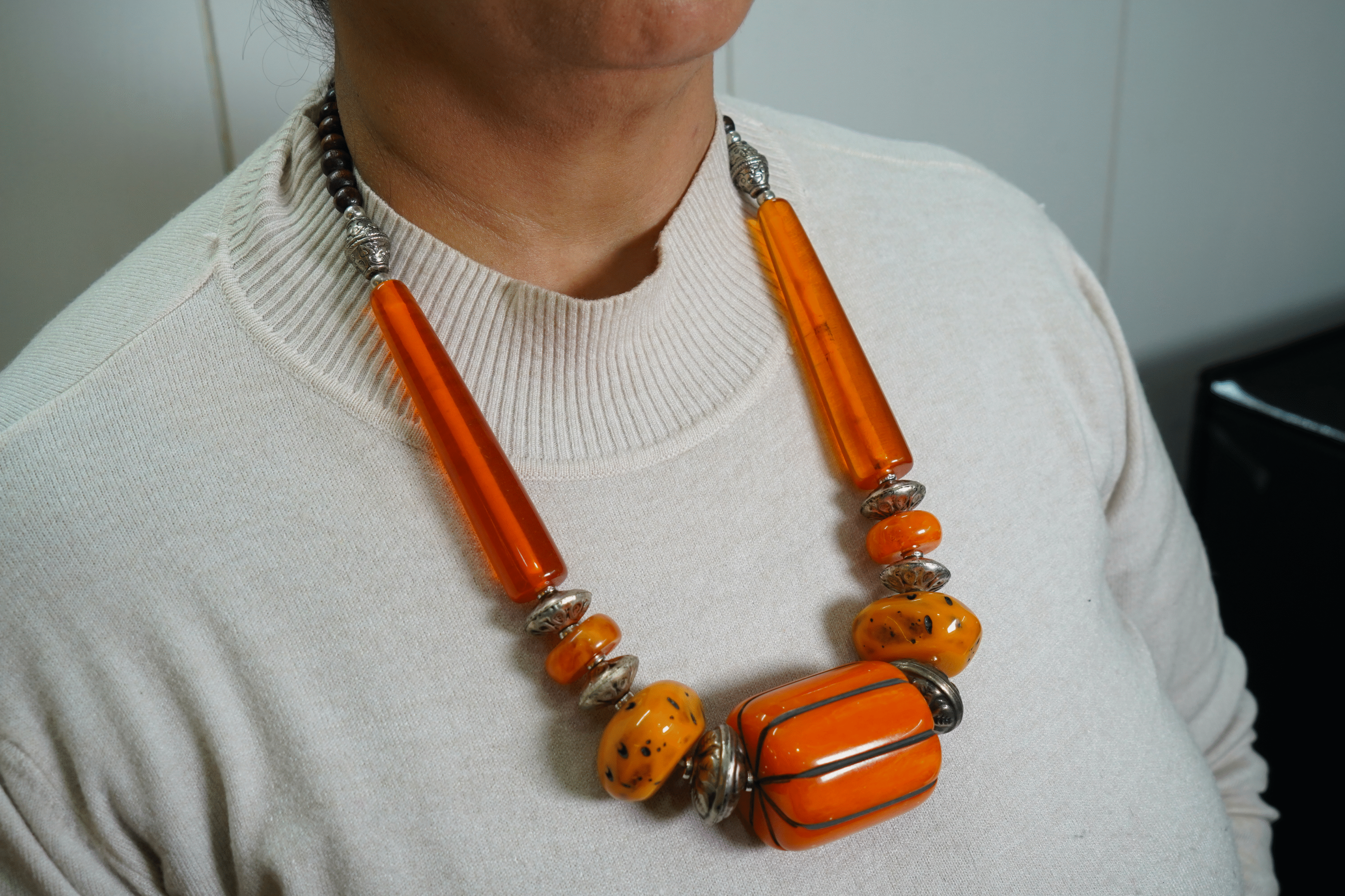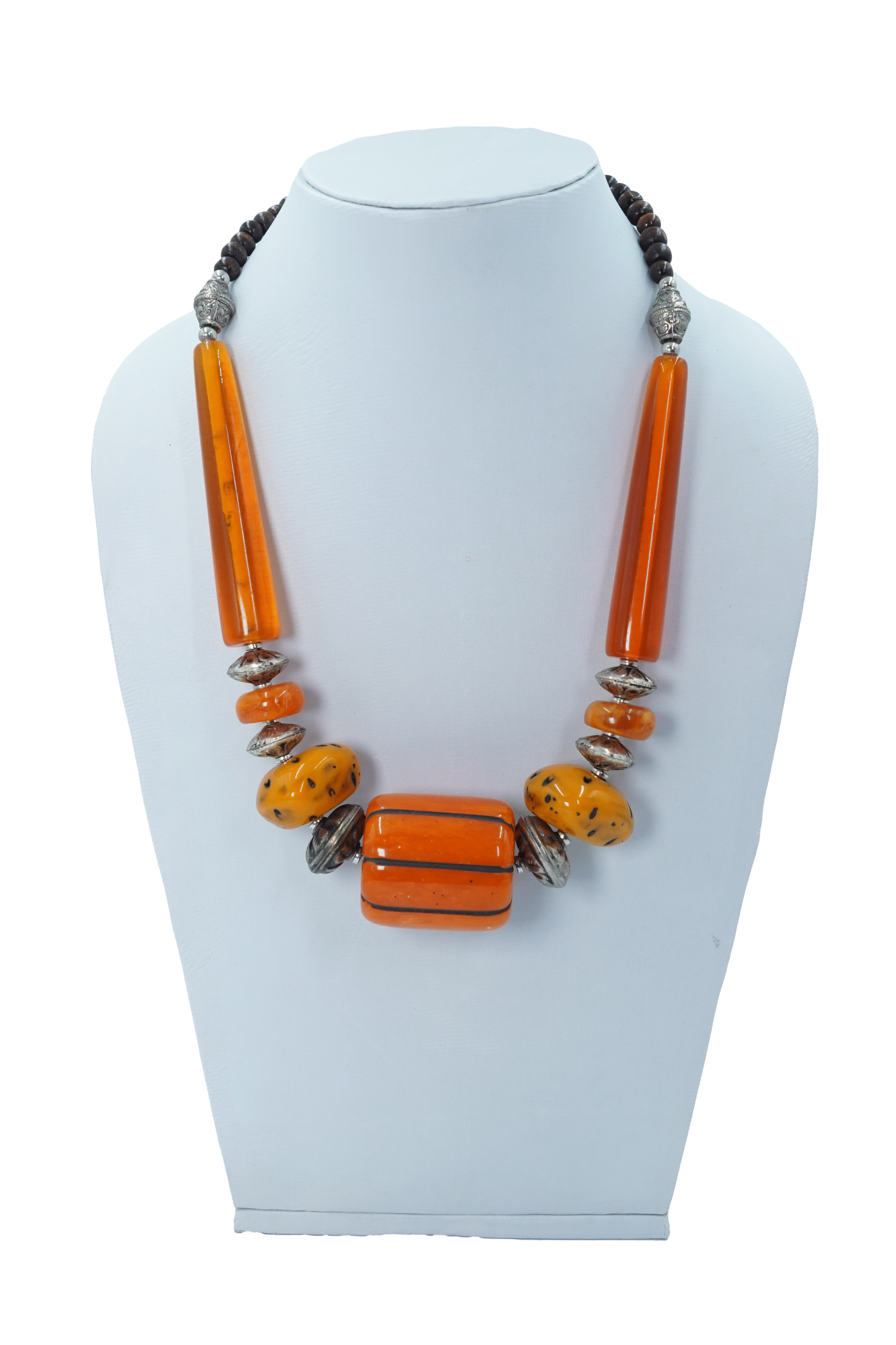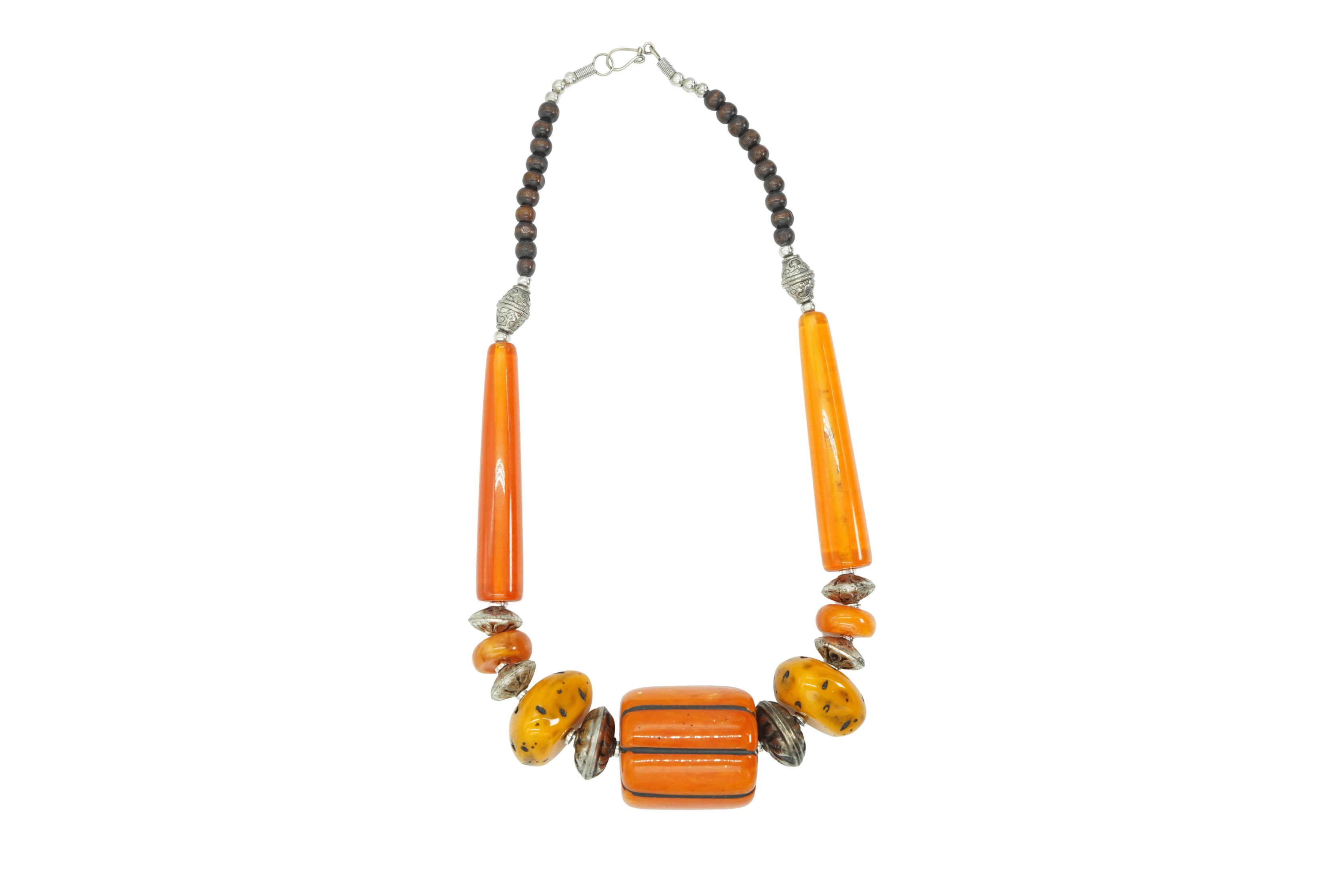 YELLOW, ORANGE RESIN BEAD BROWN WOODEN
