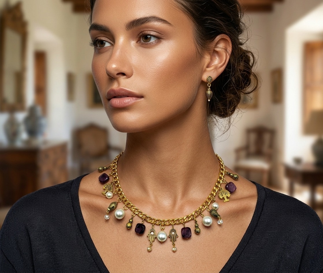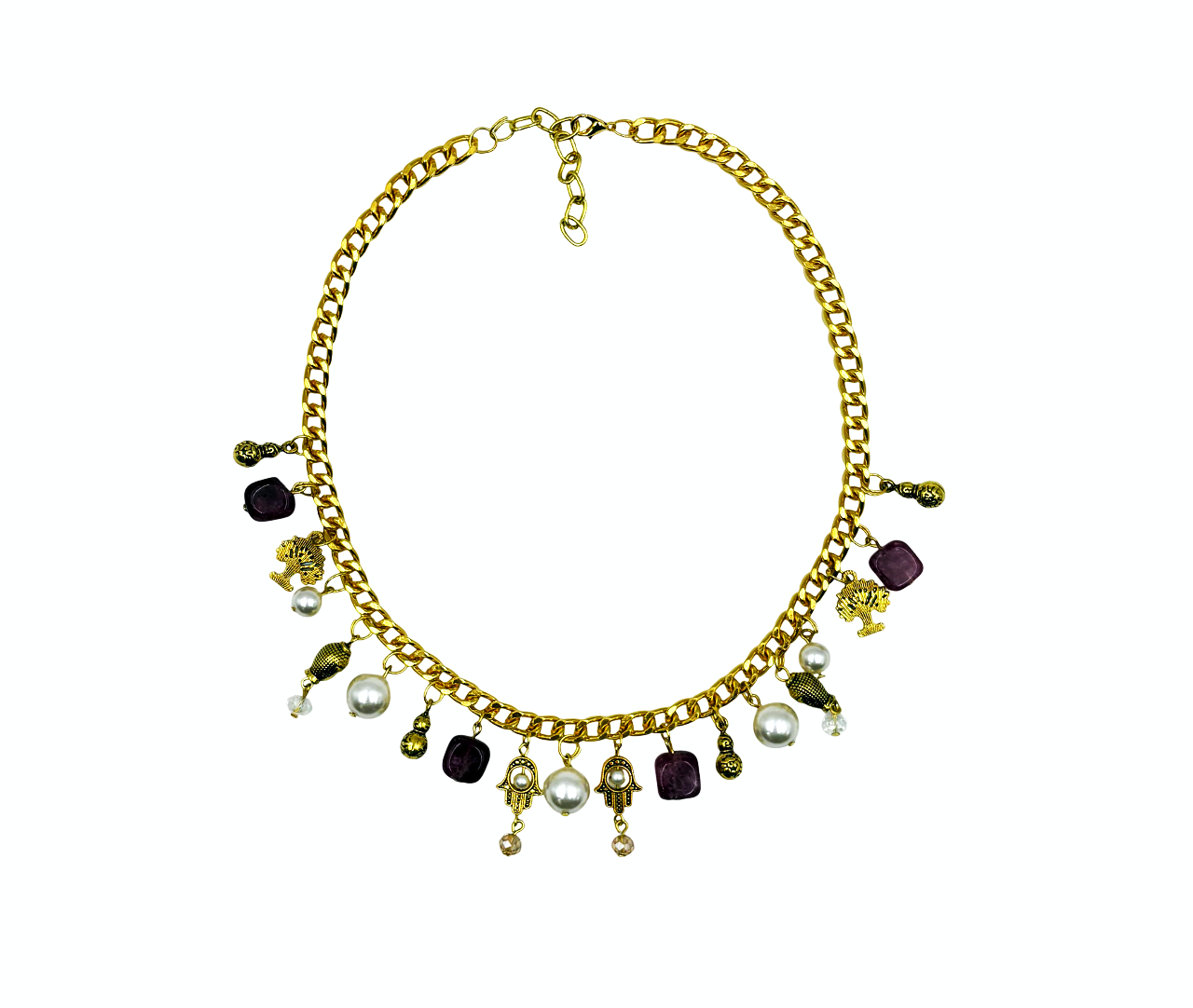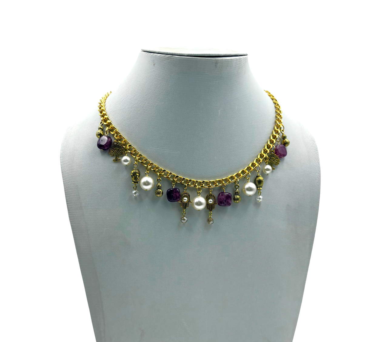 HANDMADE 6 & 10mm SHELL PEARL, METAL CHARM, AMETHYST PURPLE STONE WITH GOLDEN METAL CHAIN NECKLACE
