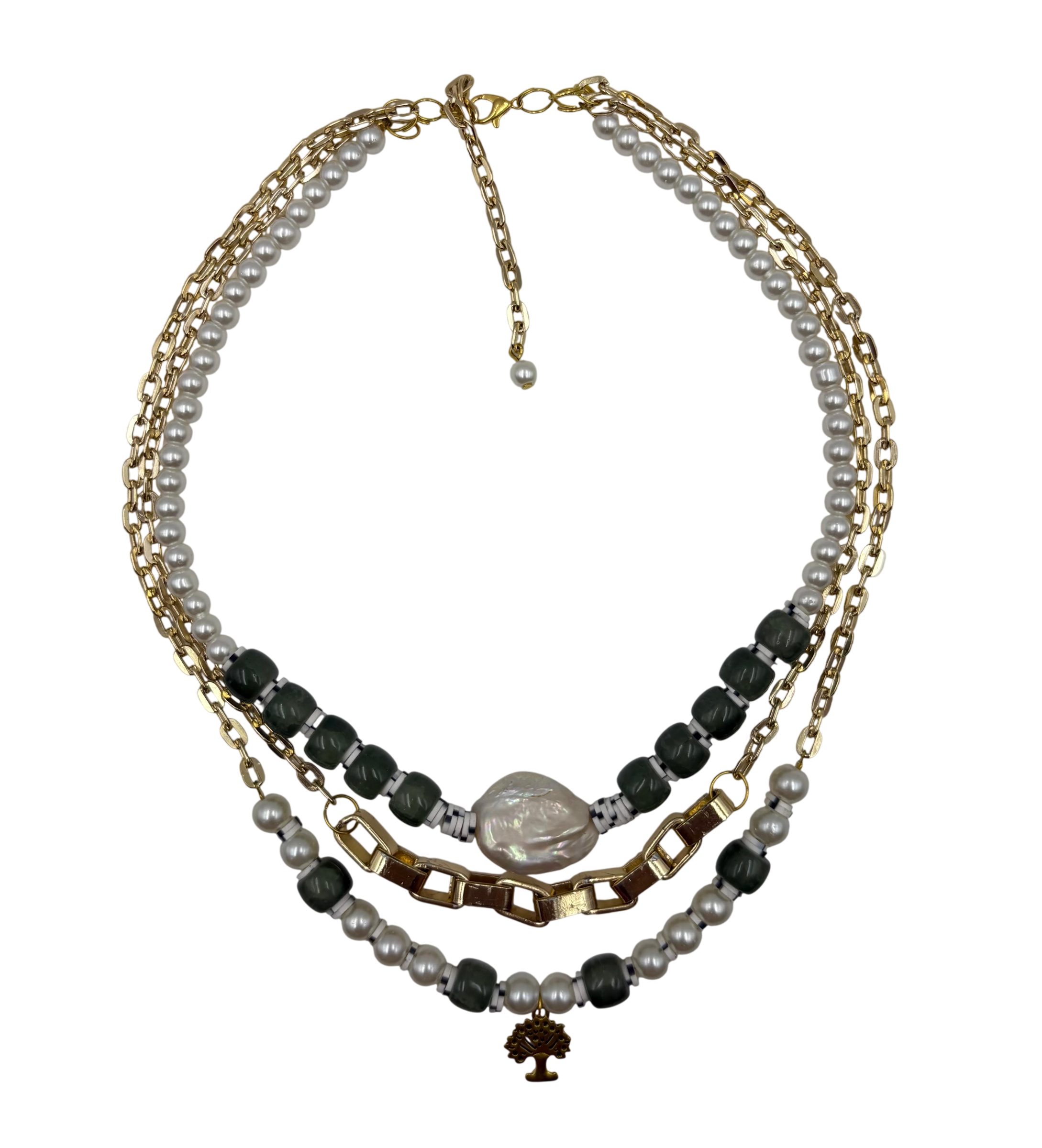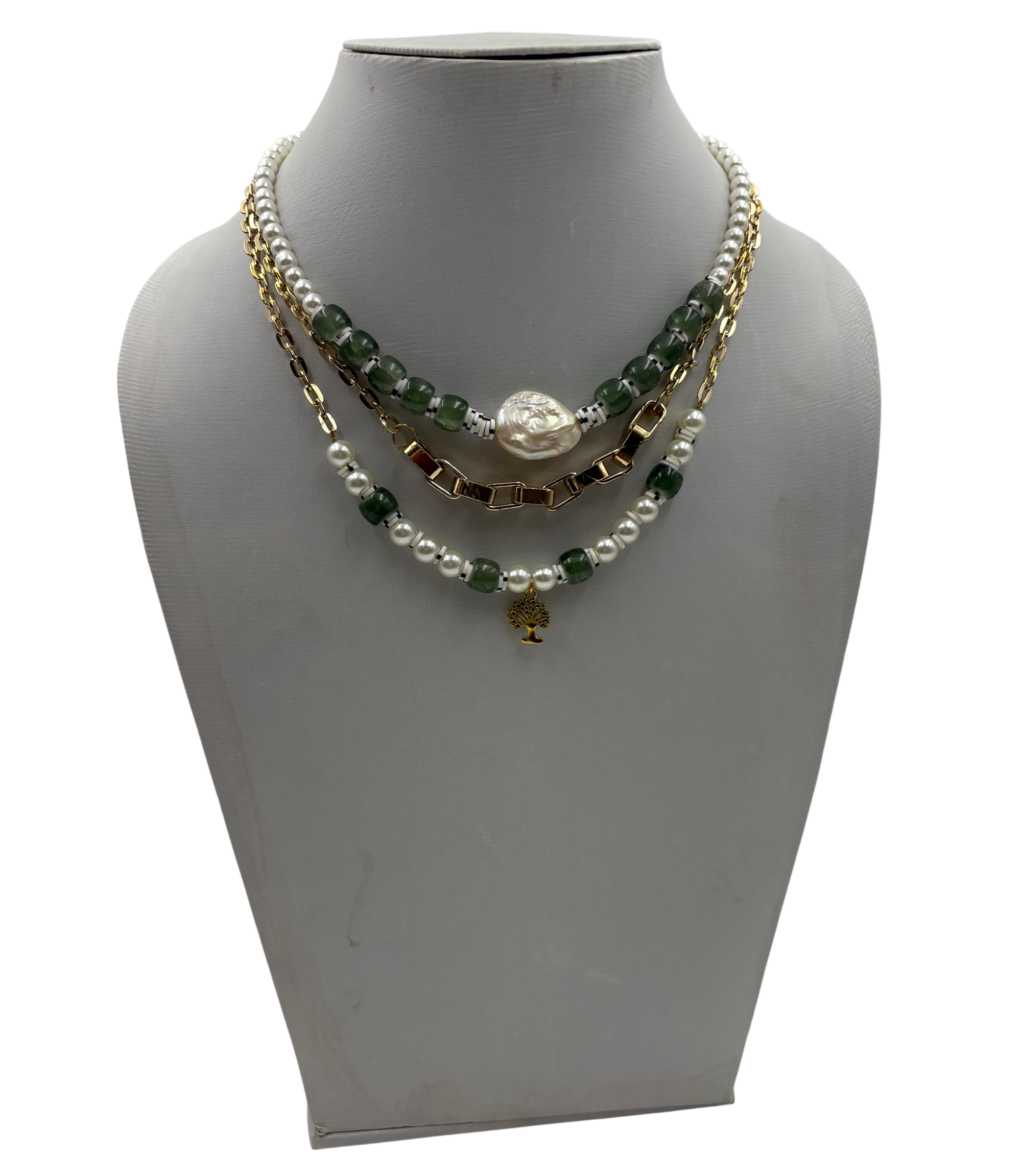 HANDMADE GLASS PEARL, GREEN GLASS BEAD AND TYRE SHAPE RUBBER RINGS WITH ROSE GOLD CHAIN AND FLAT SHELL PEARL NECKLACE
