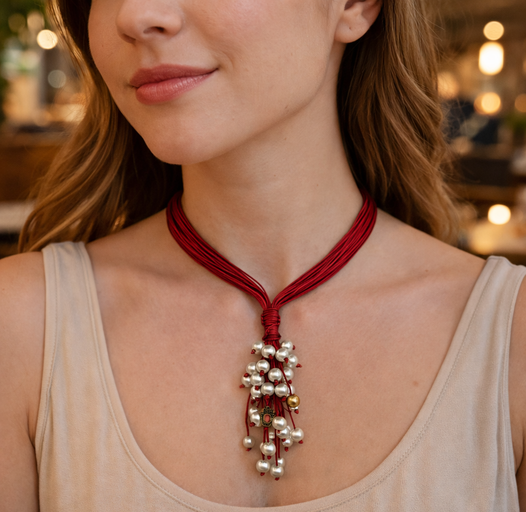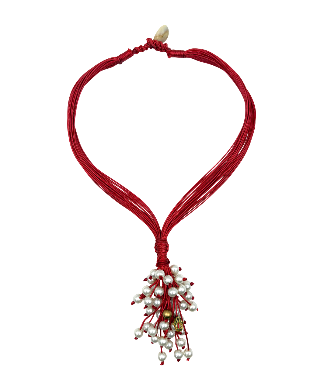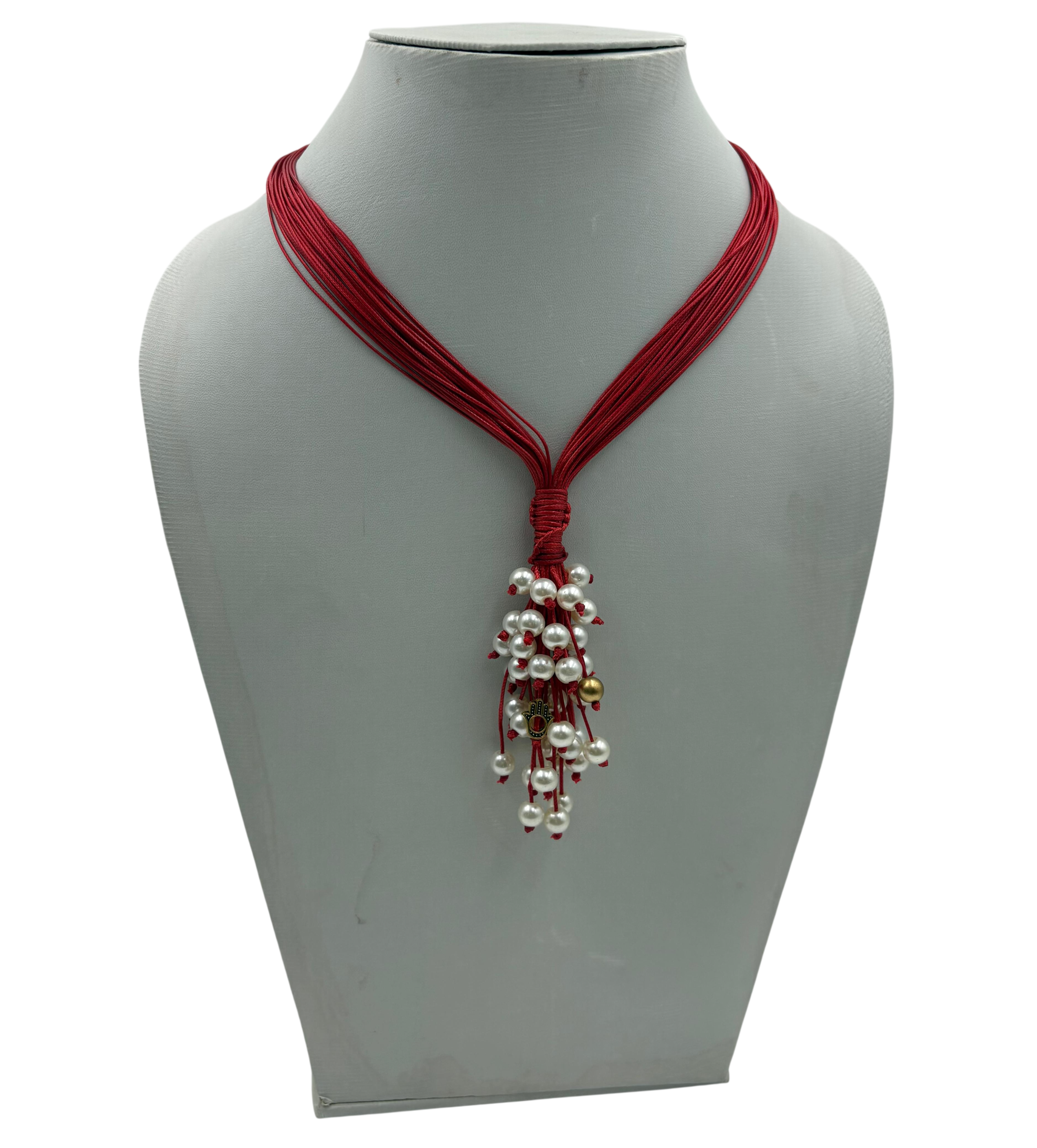 HANDMADE RED WAX CORD GLASS BEAD WITH GOLDEN METAL CHARMS AND COWRIE LOCK NECKLACE